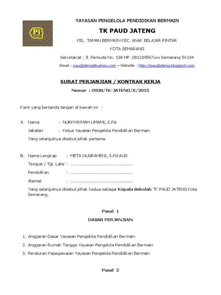 Contoh Surat Perjanjian Kontrak Kerja Guru Paud Format Microsoft Word